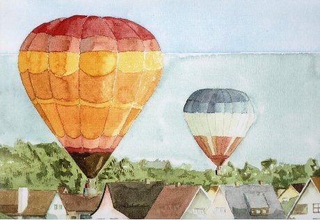 Eines Tages schwebten über ihm riesige Heißluftballons. Da kam ihm eine Idee, da einer sehr tief in der Luft hing. Mit große Anstrengung kletterte er über die Beckenmauer und robbte, wie bereits das Mal zuvor, übers flache Land den bunten Ballons hinterher. Tatsächlich erreichte er eine große Wiese, auf der schon andere Ballons gelandet waren. Hannes versteckte sich hinter einem Busch und hörte einen Menschen sagen: